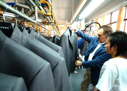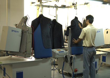 運(yùn)用高品質(zhì)的德國BRISAY立模整燙機(jī),采用電腦控制蒸汽輸出量、溫度、壓力、定型、抽濕時(shí)間,根據(jù)面料的厚薄、質(zhì)地、性能,以38種不同整燙程序調(diào)整以上各個(gè)參數(shù),配合服裝的整燙。